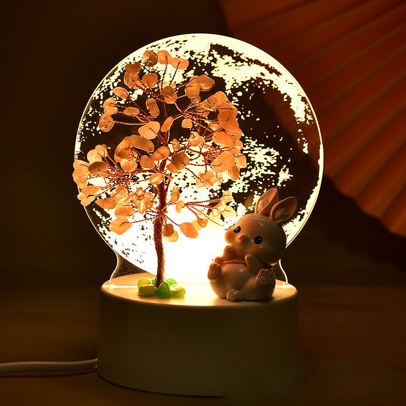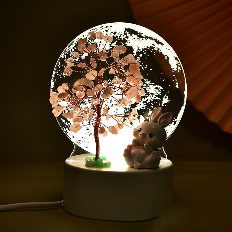 Add a touch of elegance and positive energy to your space with this meticulously handcrafted Crystal Fortune Tree. This delightful ornament features a stunning array of crystal leaves, carefully wired into a natural tree shape, perched atop a polished agate slice base. The design is enhanced with a charming ceramic bunny figure, symbolizing luck and warmth, making it an adorable yet meaningful addition to any setting. The clear acrylic backdrop with intricate patterns, coupled with its LED light base, transforms this piece into a glowing work of art, creating a soothing ambiance in your home or office. Perfect as a decorative piece or a thoughtful gift, this Crystal Fortune Tree embodies good fortune, harmony, and beauty.